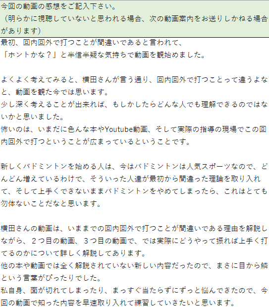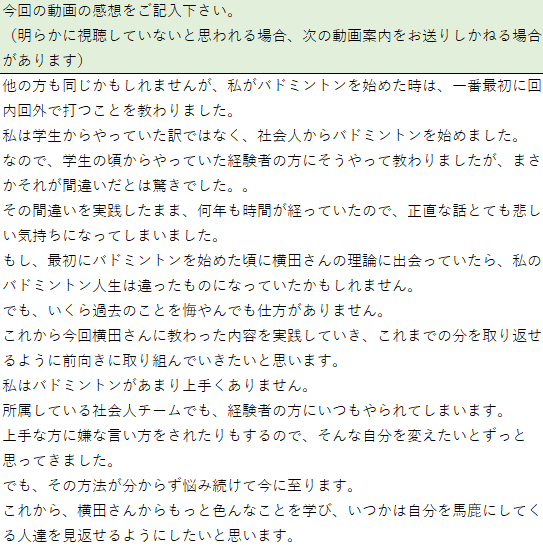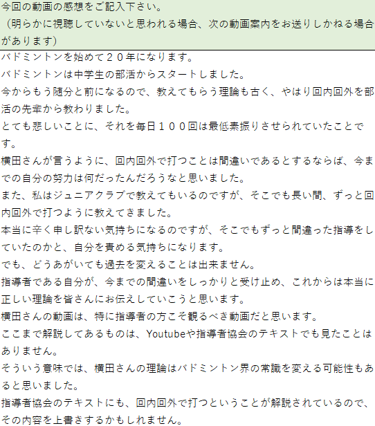 ↓「間違いだらけのバドミントン」視聴者さんのご感想:
